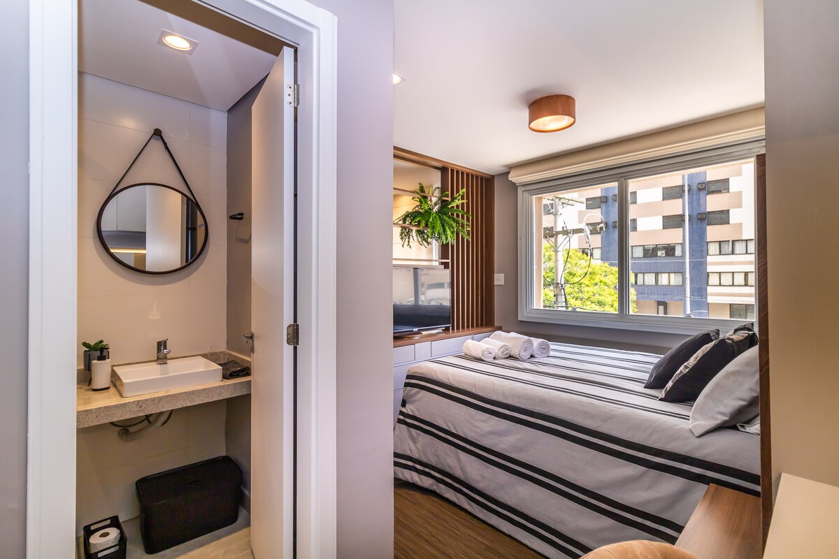 Studio dengan Pemandangan Taman dan Otomatisasi/Alexa. Garasi tertutup, dapur dengan perlengkapan dasar dan seprai/mandi. Terletak di area pusat, atap dengan kolam renang, pusat kebugaran, dan coworking. Redenção Park beberapa meter jauhnya, Organic Fair dan Brique pada akhir pekan, Refúgio do Lago gastronomy dan pertunjukan di Araújo Vianna Auditorium. Di samping bar, restoran, dan kehidupan malam Downtown Neighborhoods/Bom Fim. Akses mudah ke Guaíba Orla, universitas, rumah sakit, dan lingkungan tinggal lainnya.