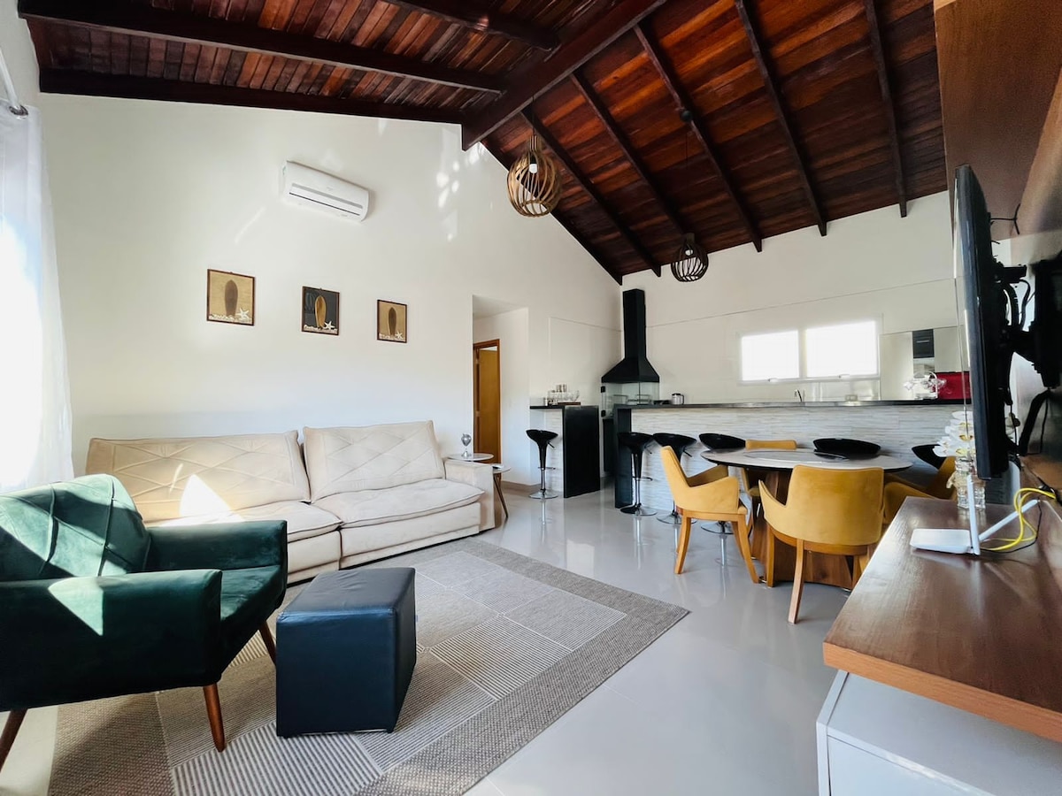Properti terletak di kondominium dengan kolam renang dan area barbekyu. Akomodasi bergaya dupleks. Lantai dasar: - Kamar ber AC dan tempat tidur sofa - Dapur terintegrasi dilengkapi kulkas, cooktop, oven listrik, dan perlengkapan dasar - kamar mandi lengkap - Area layanan Lantai atas: - Tempat tidur double - Beliche AC - Dua jendela yang menjamin ventilasi yang baik dan pencahayaan alami Penting: tamu harus membawa seprai tempat tidur dan handuk mandi. Biaya kebersihan: R$120,00 (biaya satu kali).