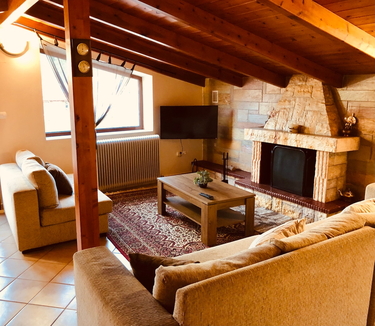 Loteng yang hangat, terang, dan luas dengan perapian di Kalavrita. Terletak dua menit berjalan kaki dari jalan utama. Apartemen ini memiliki dua kamar tidur dengan satu tempat tidur king size dan dua tempat tidur single, ruang tamu yang nyaman, dan dapur.