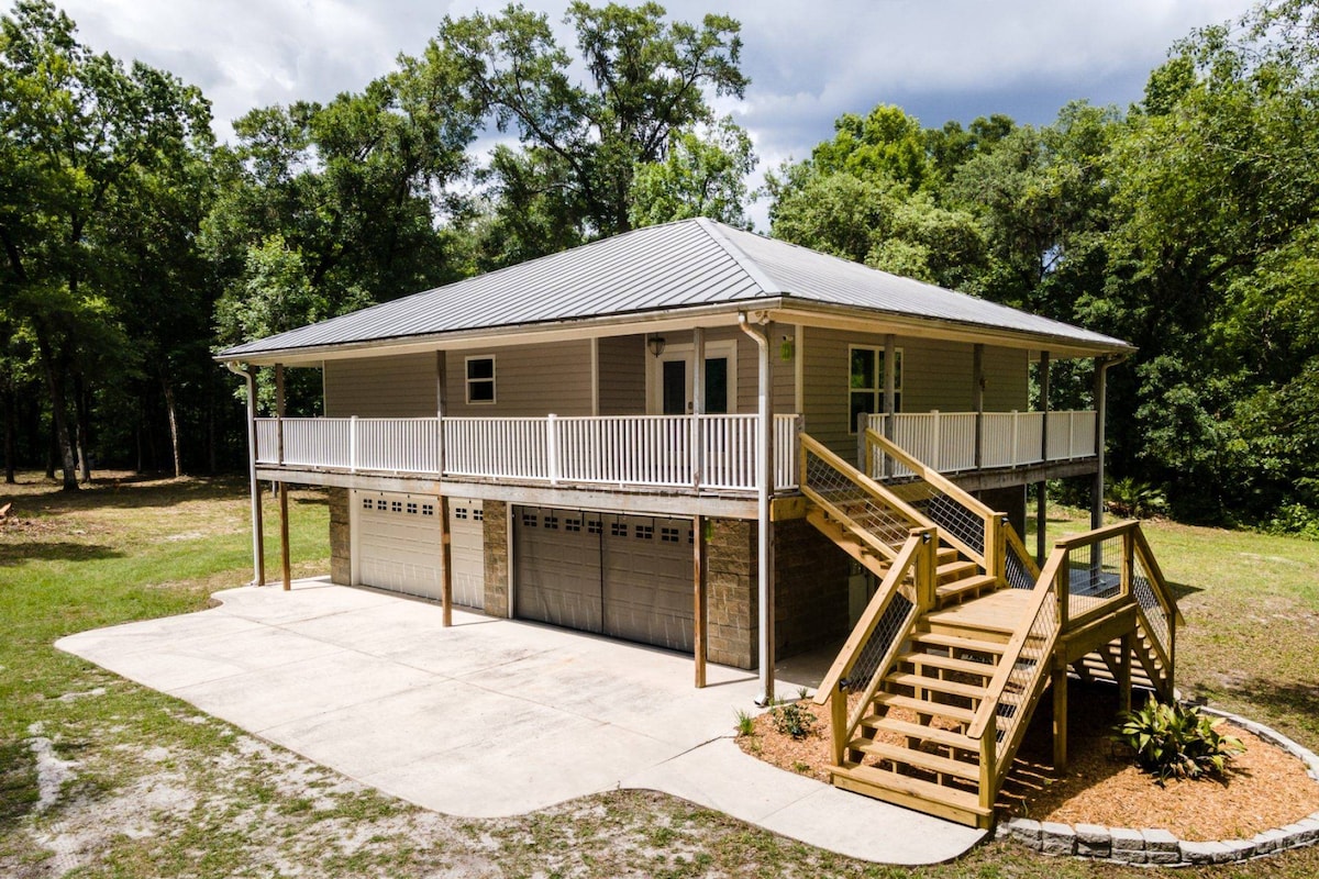 Pretty Guest House terletak di lahan tepi sungai seluas 5 hektar yang megah di Sungai St. John dengan lahan seperti taman yang dipenuhi azalea berwarna - warni, pohon ek dan hickory kuno, menetes di lumut Spanyol. Duduk dan saksikan dan dengarkan elang dan elang botak yang luar biasa di atas kepala! Bangunlah untuk menikmati matahari terbit yang ajaib setiap hari! Bass Pro Shop melakukan pemotretan di sini untuk katalog Musim Semi 2025 mereka! Rumah pemilik berada di properti dan mereka selalu tersedia. 45 menit ke Pantai JAX. 35 menit ke St. Augustine.