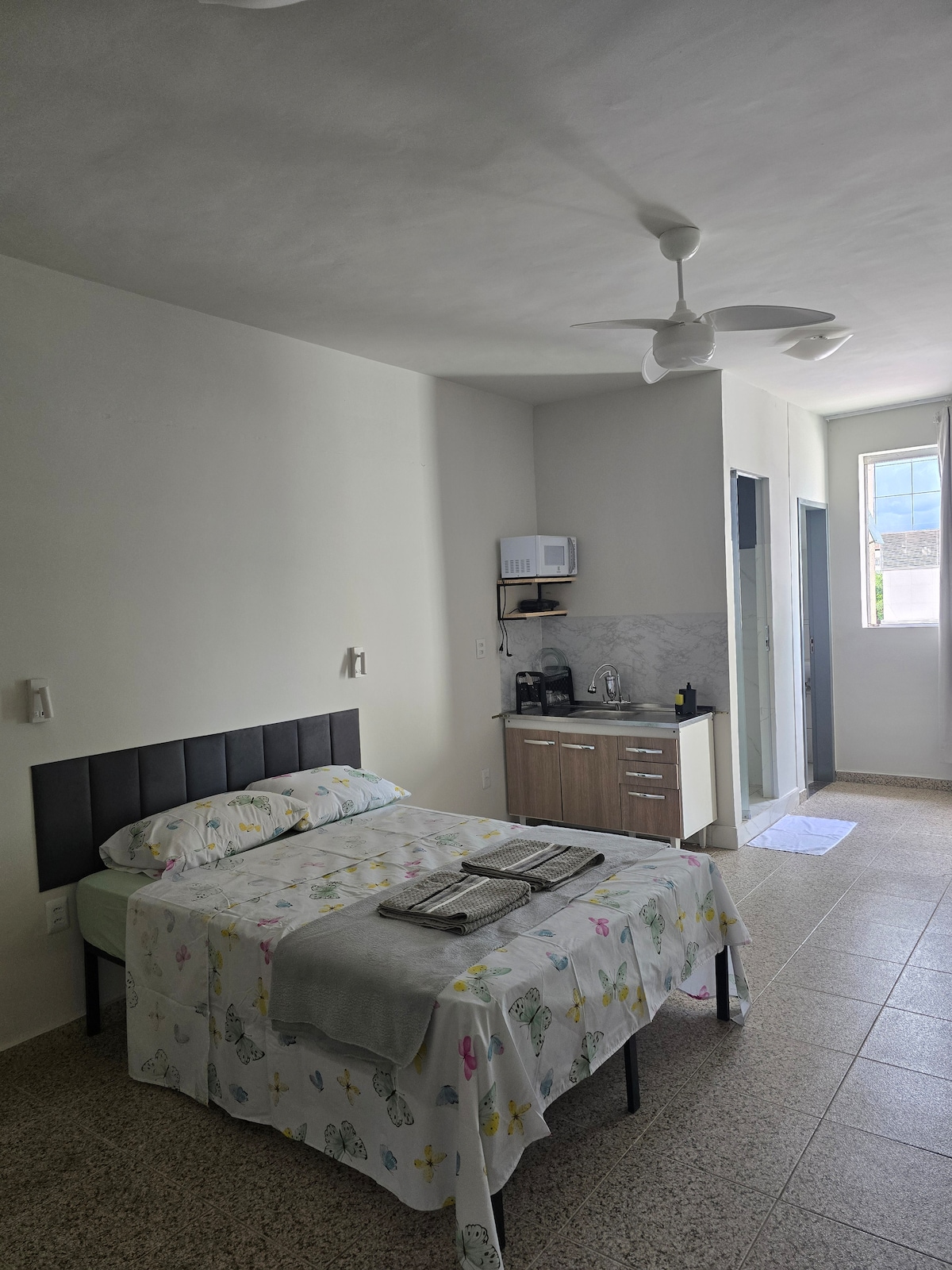 Estúdio aconchegante e funcional no bairro Jardim do Lago, região central de Nova Serrana. Localizado ao lado de farmácias, bancos, restaurantes, clínicas e comércios em geral. No terceiro andar, com elevador, portaria 24h e garagem. Conta com uma cama de casal e uma de solteiro, ambiente bem iluminado e ventilado. Cozinha equipada com frigobar de 68L, micro-ondas, mistureira, chaleira e utensílios básicos. Ideal para estadias práticas, confortáveis e bem localizadas. Wifi disponível.
