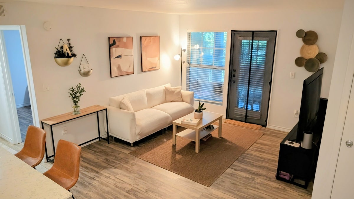Kick back and relax in this stylish, beautifully designed one-bedroom apt home with patio! This stunning home offers a blend of luxury and convenience, featuring: *Spacious Living Room *Open Floor Plan *Google Fiber Internet/WiFi *65" Smart TV *Spacious Kitchen *Stainless Steel Appliances *Large Comfy Queen Size Bed *HUGE Walk-In Closet *Washer & Dryer Inside Apartment *24/7 Fitness Center On Site *Resort-Style Pool And so much more! Perfect blend of luxury, comfort, and convenience!