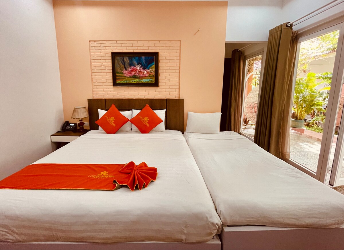 Discover serenity in our intimate room for two at Lotus Garden Resort. Adorned with unique decor blends artistry with comfort. Enjoy a garden view, and unwind some extra services: breakfast buffet, sauna, tour guide and massage services. For ocean lovers, a one-minute walk brings you to the coast. Our central location provides easy access to numerous attractions, like Fairy Stream, Orange Sand Dunes, Mango Beach, Wine Castle, etc. only within 5-15 min drive