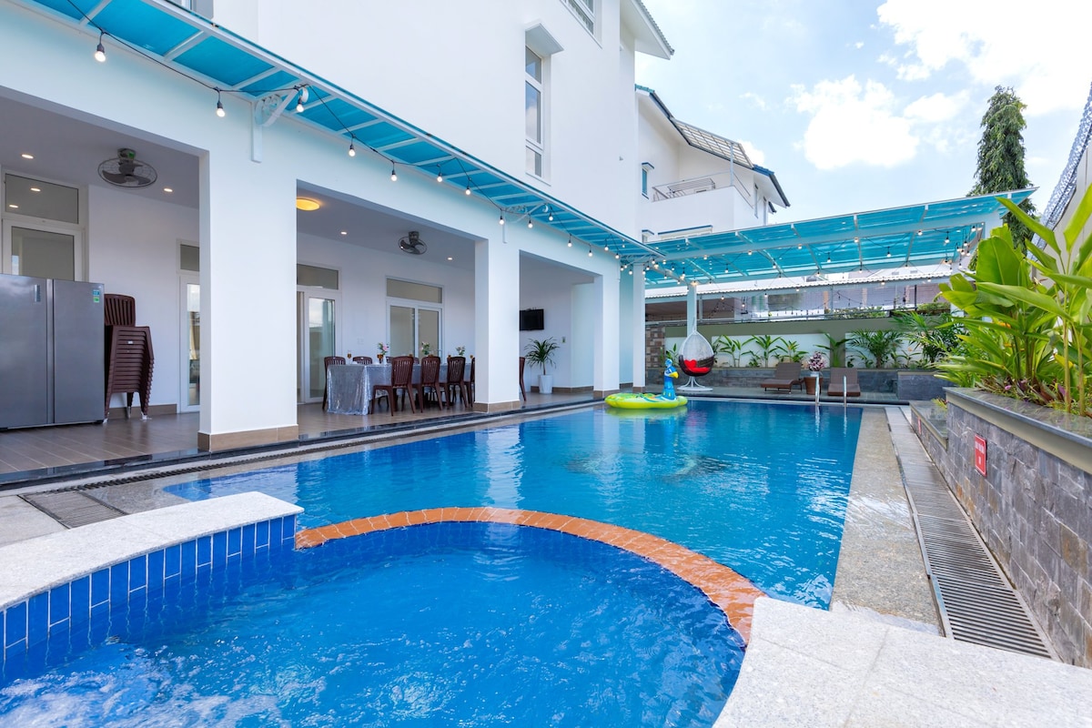 Villa chỉ cách bãi biển tầm 100m. Cách trung tâm thành phố và các địa danh du lịch của Vũng Tàu trong bán kính 5-7km. + Sức chứa lý tưởng: 15 - 22 khách. + Tối đa: 30 khách. + Diện tích khuôn viên: 460 m2. + Diện tích hồ bơi: 50 m2 + Quy mô 8 phòng ngủ, mỗi phòng ngủ đều có wc riêng, view nhìn ra biển, hồ bơi hoặc sân vườn tùy vị trí. + Phòng Karaoke: 24m2 (diện tích đã bao gồm wc) + Sảnh giải trí trang bị bàn Billiards lỗ + BBQ