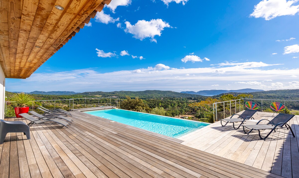 Vila 4* baru yang indah seluas 176 m² ini memiliki pemandangan laut dan pegunungan yang menakjubkan serta kolam renang pribadi yang dipanaskan. Tenang, 10 menit dari pusat Porto - Vecchio dan 15 menit dari pantai Villa terpisah ini dilengkapi dengan empat kamar tidur dan tiga kamar mandi. Ada AC dan TV di setiap kamar Dapur musim panas, boulodrome, internet wifi, pembuat kopi Nespresso, speaker, barbeku gas, kursi berjemur