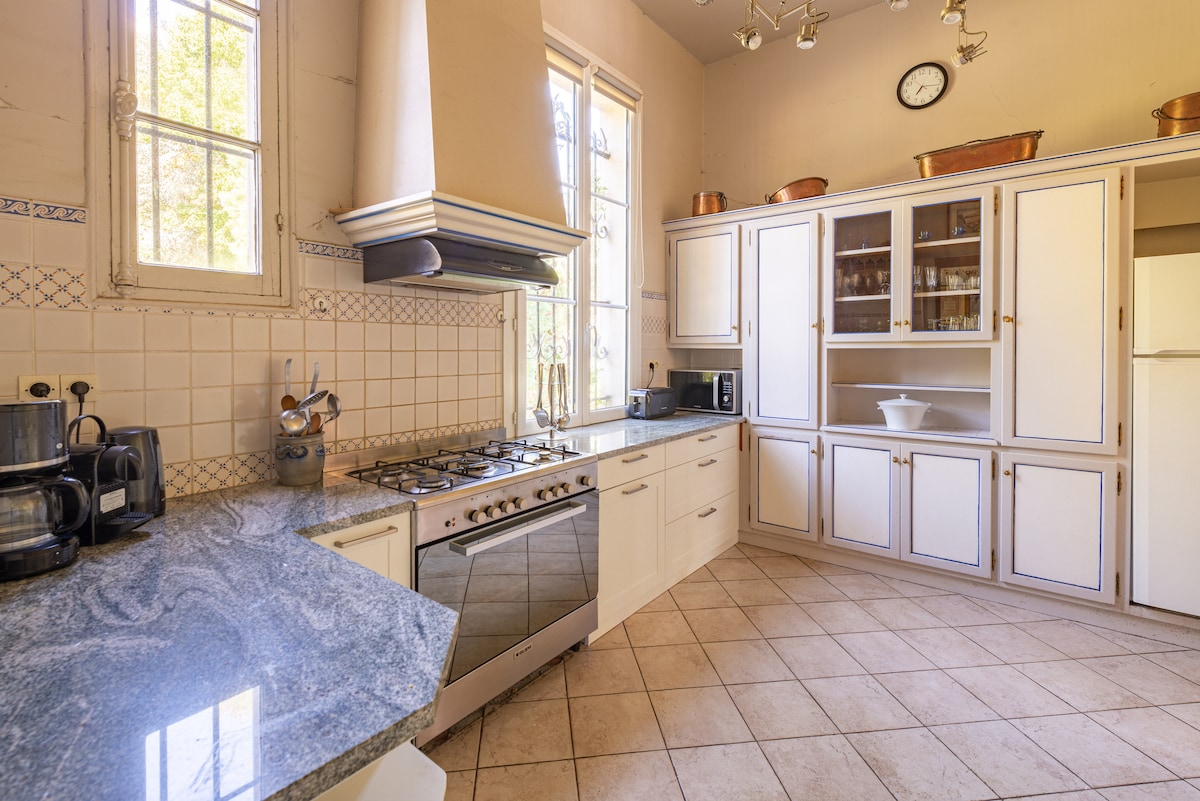 Chateau yang indah, kolam renang berpemanas, dan lapangan tenis.