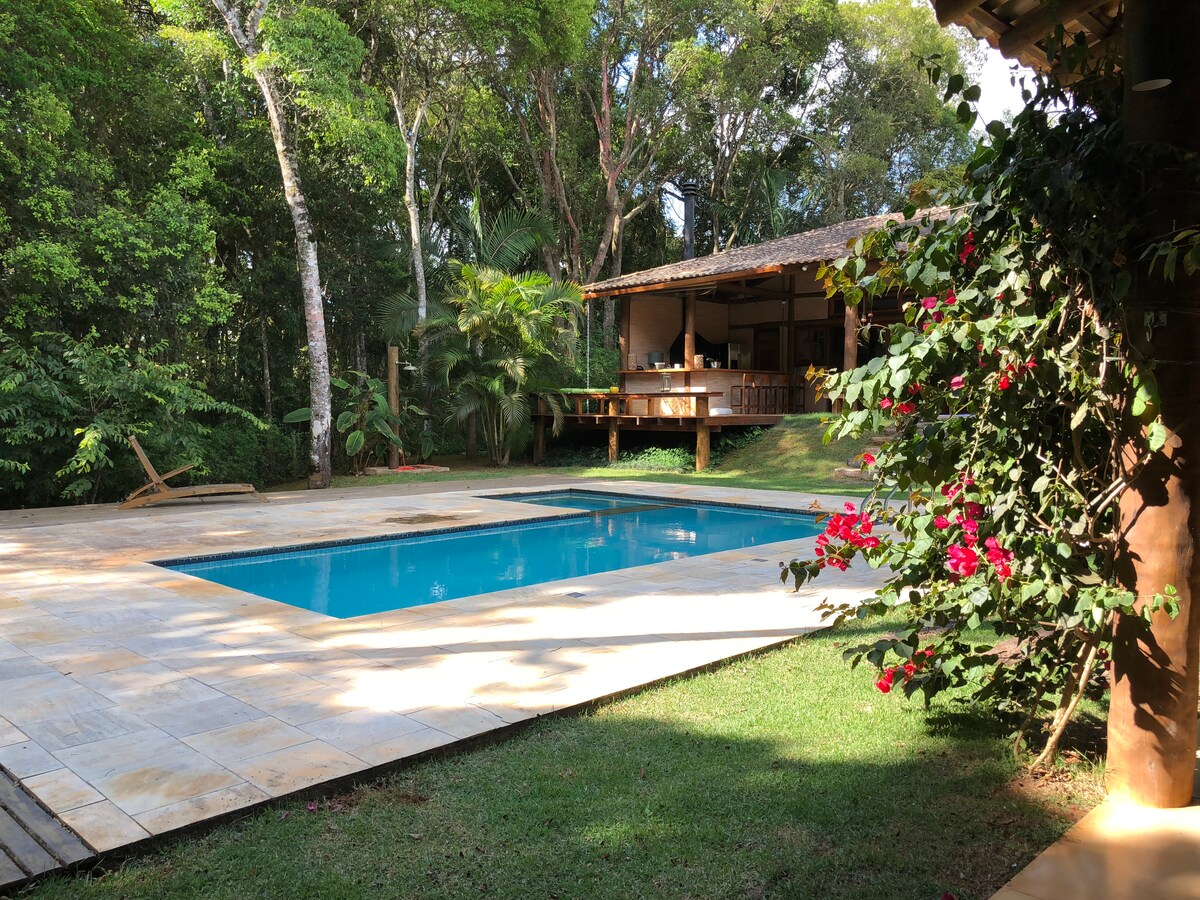 You will be staying in a charming place, with lots of greenery, comfort and unparalleled structure. The house: Located in a quiet region in a gated community with total security, overlooking the forest reserve area, it is the perfect place to rest and relax. Private entrance, indoor and outdoor fireplaces, swimming pool, barbecue and large lawn. (Equipped kitchen) Guests have access to a vegetable garden (subject to availability), with 100% organic products. Your pet is welcome.