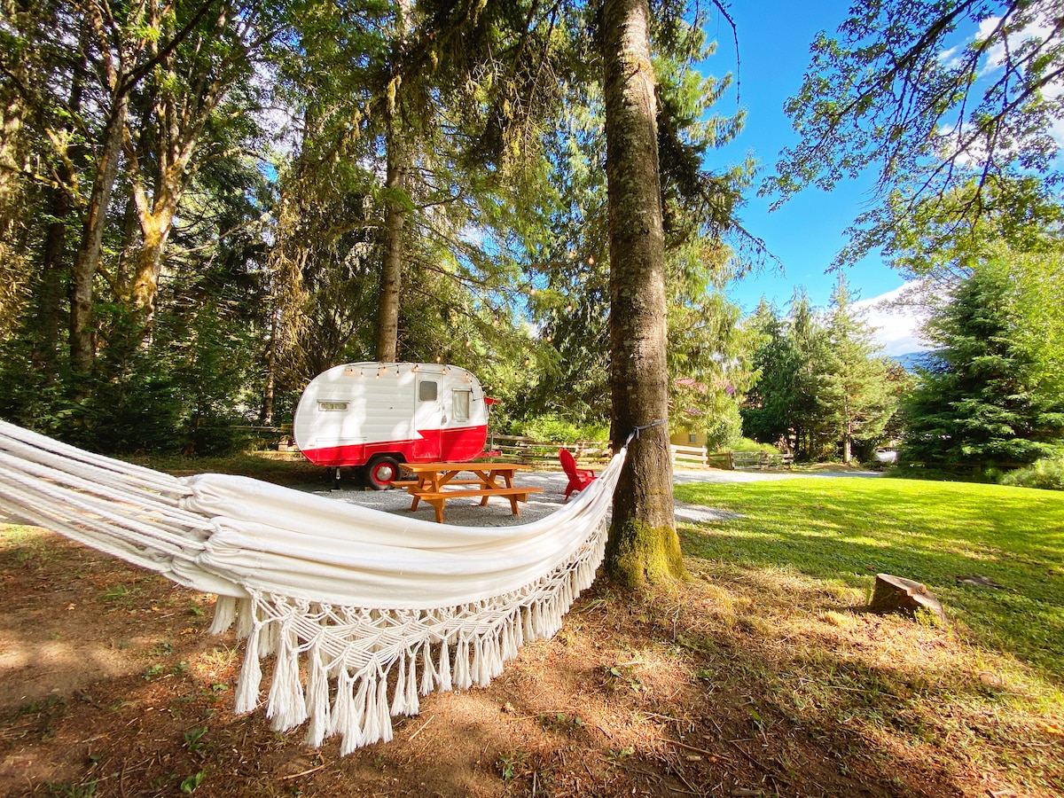 "Darla" adalah trailer perjalanan asli tahun 1955, terselip di tempat berkemah pribadi di properti indah kami yang hanya berjarak 6 mil dari Mt. Taman Nasional Rainier! Menampilkan dekorasi vintage, dapur kecil, lampu senar, meja piknik, perapian gas, kursi santai, tempat tidur gantung, trailer kamar mandi terpisah dengan pancuran air panas, dan akses ke bak mandi air panas pondok! Terletak di pinggir kota Ashford dan berjalan kaki ke restoran dan toko, ini adalah basis sempurna untuk semua petualangan Mt. Rainier Anda!
