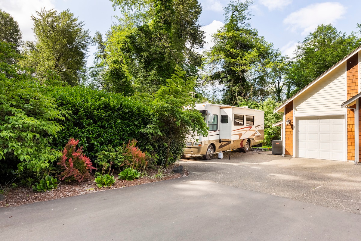 Bersantai dan bersantai di tempat peristirahatan indah yang indah ini. RV 30 kaki dengan ratu pendek di master dan ranjang kembar sempit di kamar tidur kedua, di samping rumah kami di properti pertanian seluas 40 hektar. Makan malam dapat diubah menjadi kembaran kecil dan ada tempat tidur sofa ganda kecil di ruang tamu. Akses mudah ke Jalan Raya 161, 30 mil dari pintu masuk ke Mt. Taman nasional Rainier, namun properti memiliki nuansa terpencil. Termasuk penggunaan dek, BBQ, dan bak mandi air panas bersama. Pemandangan Gunung Rainier yang fantastis.