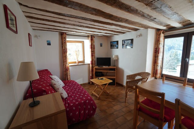 Studio besar yang terang, balkon panorama, tempat tidur 4 Di pintu masuk ke desa, 31 m2 dengan area dapur, perapian dan tempat tidur sofa ganda, area tidur dengan 2 tempat tidur pull - out, kamar mandi, loker ski, balkon Menghadap ke selatan dengan pemandangan indah yang tak terhalang. Parkir mudah; toko kelontong dan halte bus di dekat chalet. Di jalur GR58, harta karun Taman Nasional Queyras milikmu!