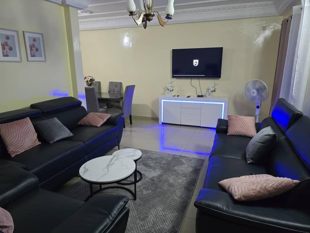 Apartemen ini sangat luas, terawat dengan baik, berisi balkon, dapur besar, dua kamar tidur, dua kamar mandi, dan toilet pengunjung, ruang tamu, teras, wifi, TV, air panas, AC, seprai, tangki air pembersihan dilakukan setiap hari kecuali pada hari Minggu, kamar ber - AC, meteran listrik dibayar di muka setelah menginap seminggu, itu adalah tanggung jawab Anda (5000fcfa ) per biaya .