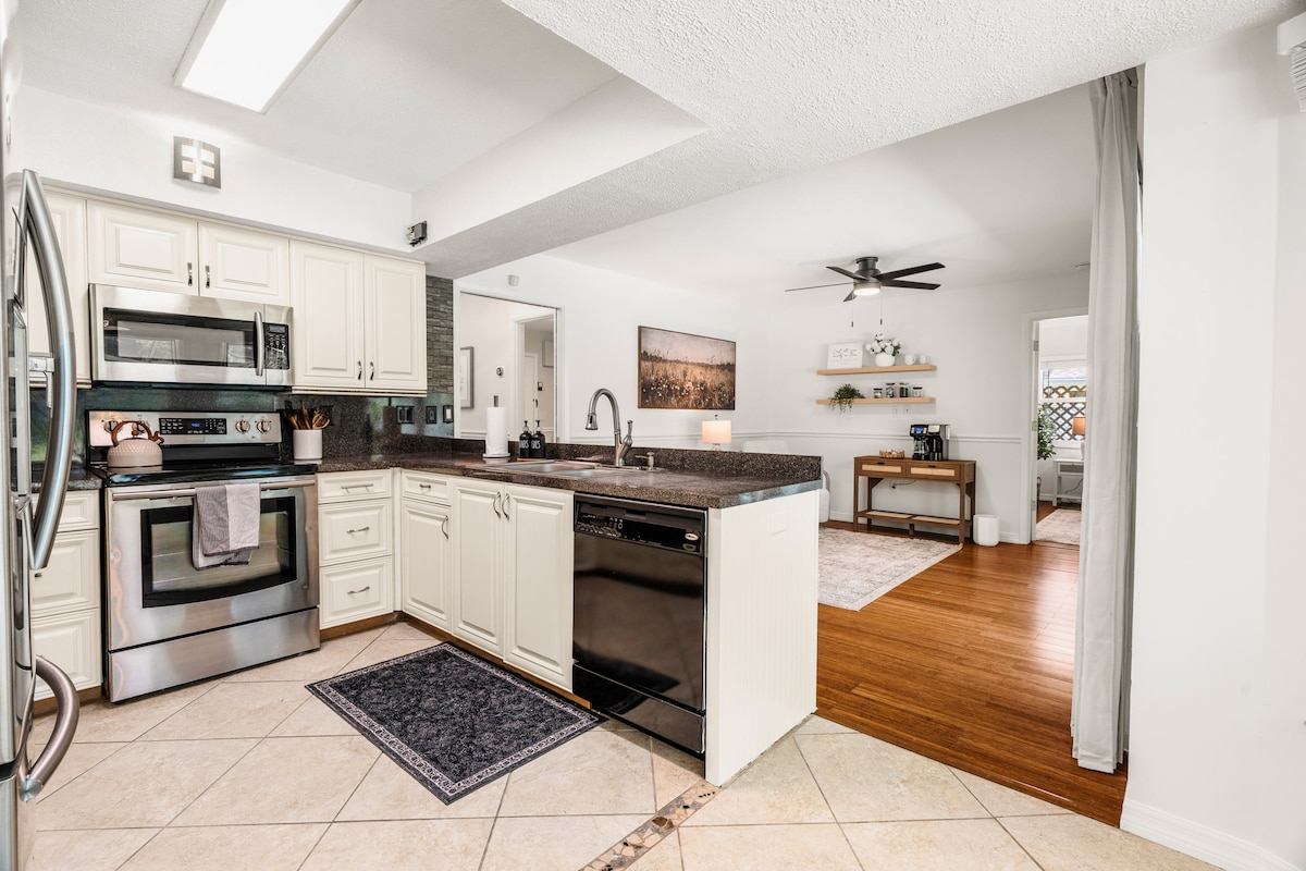 Selamat datang di apartemen kami yang baru direnovasi dengan tempat tidur berukuran King dan dapur lengkap. Parkir di jalan masuk dan proses check - in mandiri membuat ini adalah masa inap yang aman dan nyaman baik Anda bepergian sendirian atau sebagai pasangan. Terletak di jalan yang tenang namun dekat dengan jalan utama dan akses ke Legacy Trail + lapangan bola acar Pompano di ujung jalan kami. 5 menit ke Pinecraft, es krim lokal, restoran & sekitar 7 mil ke Siesta Key dan Lido Key Beach dan 15 menit ke bandara Sarasota.