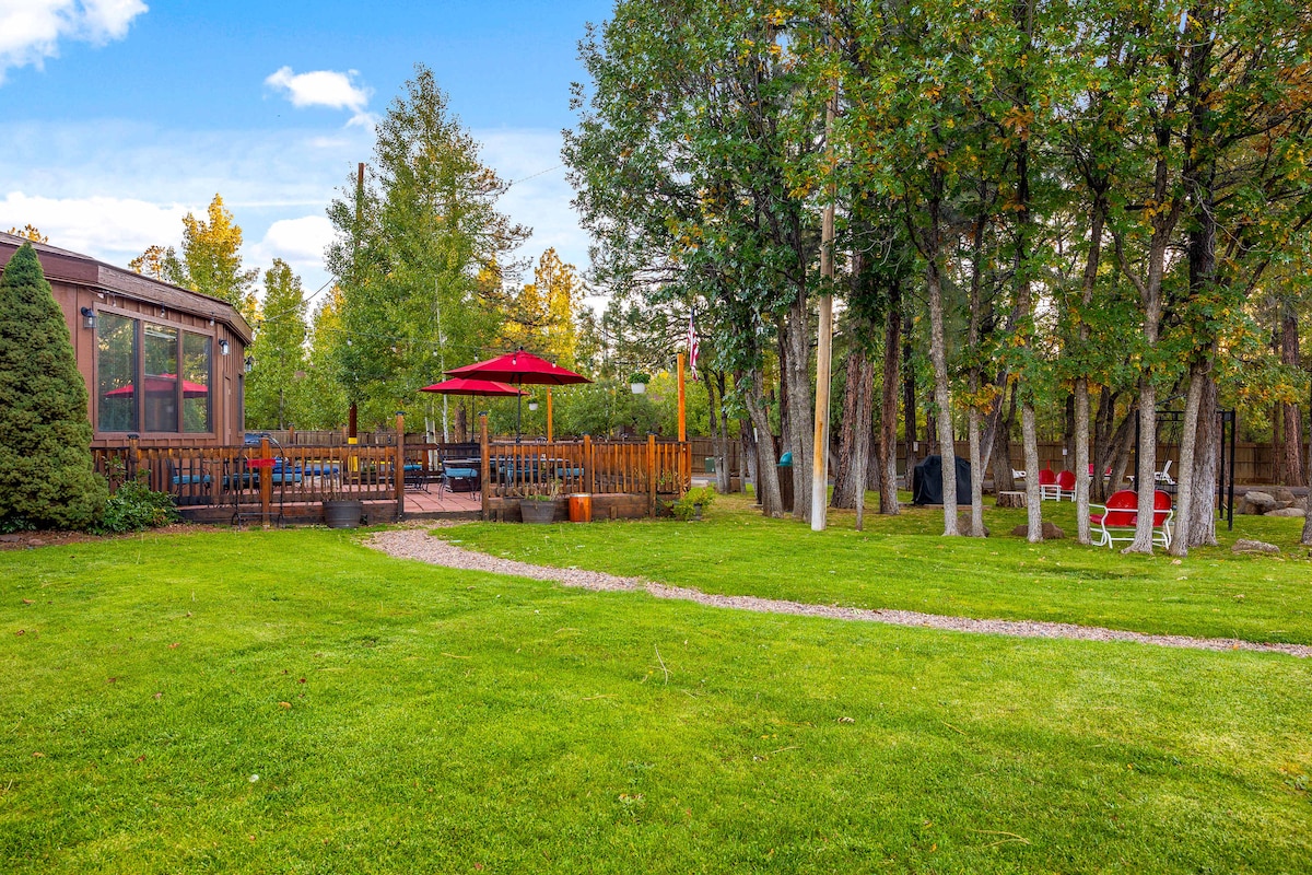 Nikmati waktu bersama keluarga Anda di Kabin Bergaya Swiss kami. Kabin kami bisa menampung hingga 27 orang yang membuatnya sempurna untuk berkumpul bersama keluarga besar. Kabin ini memiliki bak mandi air panas, perapian, ayunan luar ruangan, pengisi daya kendaraan listrik, dan permainan arcade dengan 1600 permainan! Dekat dengan ski dan 1 mil dari Rainbow Lake! Anda akan senang duduk di luar di sekitar perapian dan mendengarkan pohon - pohon pinus yang berbisik. Jika Anda membutuhkan lebih banyak ruang, tanyakan kepada kami tentang Kabin kami dengan Rumah Pohon yang dapat menampung tambahan 32 orang yang berjarak kurang dari satu mil.