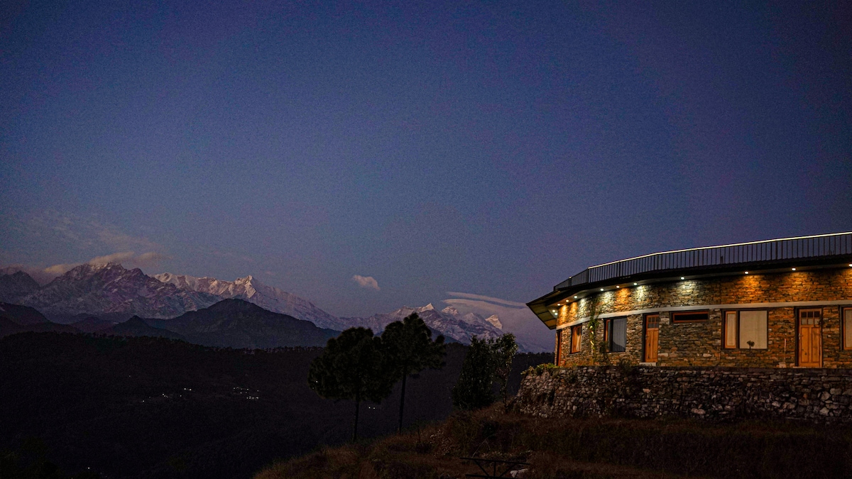 Camouflaged amidst a virgin pine and oak forest at 7000 feet, on the slopes of a remote, yet reachable, hamlet called Chalnichina (50 kms from Mukteshwar), is a soulful 02 Bedroom Private Retreat aptly called "The House on the Slope". The House sits upon multiple terraced fields giving way to a unique layered architecture. An all-glass skylight runs through the roof and transitions into the front wall of the house offering breath-taking views of snow-capped Himalayan peaks such as Trishul .