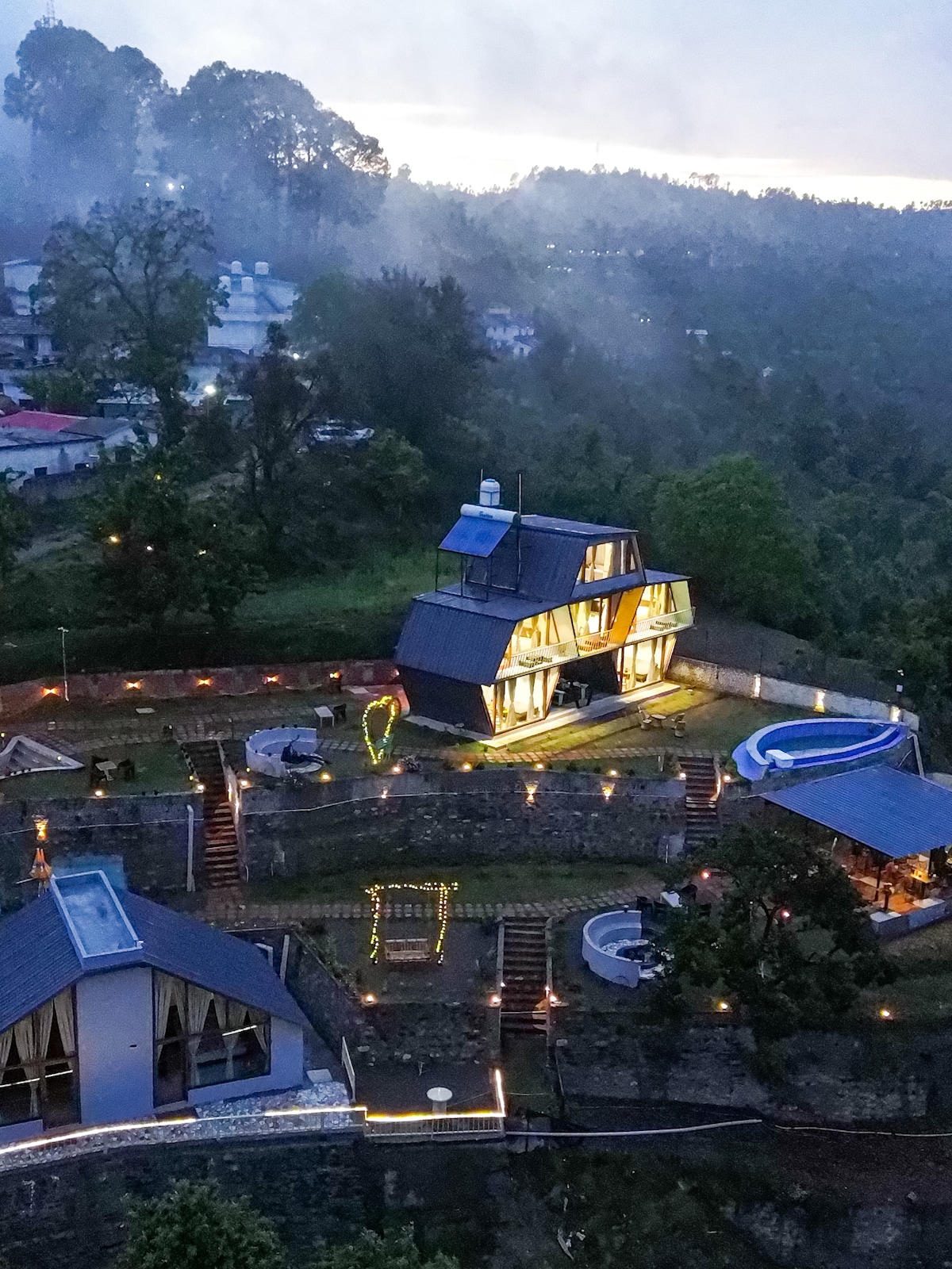 A design duplex for couples or a small family. Big glass, warm wood, open views. Quiet hours, slow days, easy nights. Suramya brings space and warmth together. The hexagon form keeps the view present in every corner. It fits couples well and also works for a small family. WiFi is fast, power is backed up, and parking is free. Getting here is simple from Delhi and from Kathgodam. It is a calm place. Plan to rest.