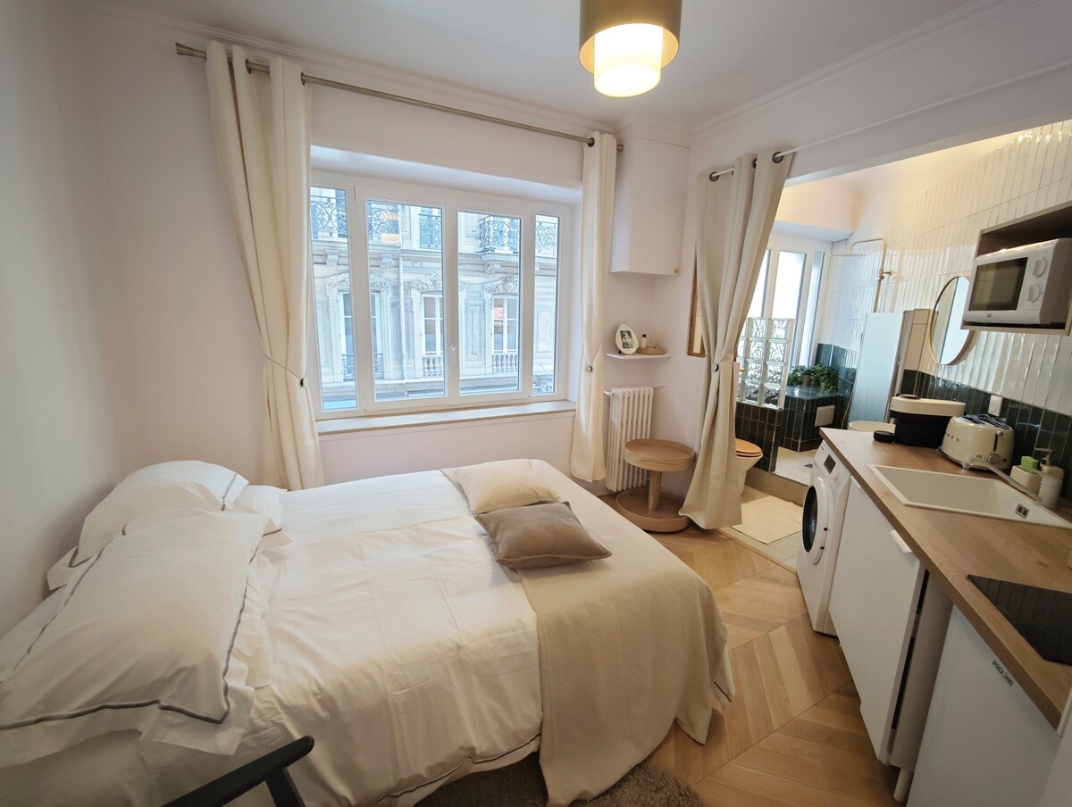 Datang dan nikmati studio seluas 25 m2 yang menawan, tepat di tengah - tengah Paris. Terletak di antara Madeleine dan Grands Magasins, apartemen ini, di lantai 1, akan membawa Anda semua kenyamanan untuk menikmati masa inap Paris Anda sepenuhnya, baik turis maupun profesional. Baru - baru ini direnovasi. Tempat Tidur King (180 x 200 cm), dapur lengkap (oven kombinasi microwave, mesin cuci piring, pembuat kopi Nespresso, kompor...), toilet terpisah.