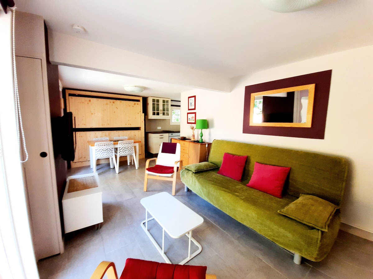Kokong kecil yang luar biasa, semua kenyamanan, 5 menit berjalan kaki ke pantai, bar, dan restoran paling populer di Saint Aygulf. Studio berukuran 20 m2 yang baru direnovasi ini telah dioptimalkan untuk memungkinkan tidur untuk 3 orang (1 tempat tidur nyata di ceruk kecil dan 1 tempat tidur di tempat tidur sofa). Ruang tamu kecil, tetapi Studio menawarkan dapur sungguhan (hotplate, mesin cuci piring, oven) dan teras 16 m2 untuk makan di luar. Dekorasi asli akan membuat masa menginap Anda unik!