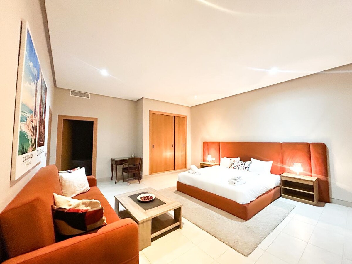 Tingkatkan masa inap Anda di studio butik berukuran 50 meter persegi ini, tempat kehangatan Maroko yang autentik bertemu cakrawala yang menakjubkan. Terletak di lantai 9 dengan orientasi menghadap ke Barat, Anda akan menikmati pemandangan bukit Anfa dan Samudra Atlantik yang tidak terhalangâkursi baris depan yang sempurna untuk matahari terbenam keemasan Casablanca. âKami memprioritaskan kenyamanan Anda dengan perlengkapan tidur kelas atas, seprai premium, dan desain interior yang nyaman dan penuh jiwa yang terasa seperti di rumah.