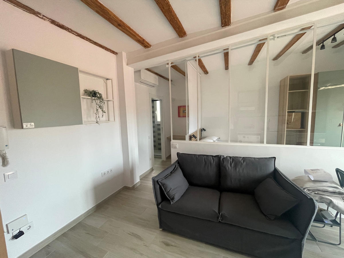 Apartemen mini yang baru direnovasi dan nyaman, terletak di tengah - tengah desa Tiana. Terdiri dari 23 m2, didistribusikan di ruang tamu yang dilengkapi - kantor, double bed dan kamar mandi lengkap. Ideal untuk pasangan yang mencari ketenangan, menikmati alam, dan menikmati pantai. Termasuk parkir pribadi.