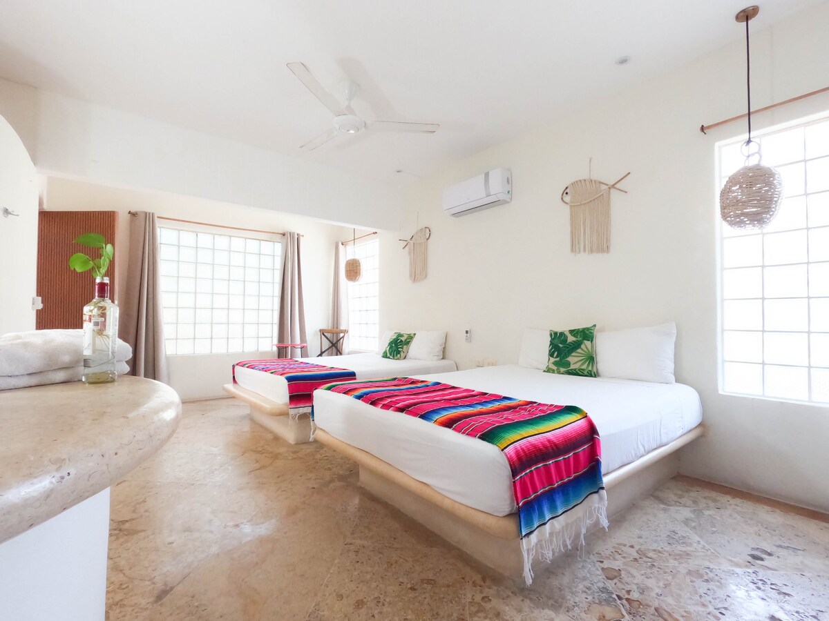 Retret tingkat taman 6 blok dari Malecón. Bersantai di tempat tidur king, memasak di dapur Anda sendiri, dan streaming dengan serat 50/50 Mbps. Divers get dedicated rinse bins; digital nomads, a patio cowork bar. Berjalanlah ke kafe, kapal feri, taco, dan dermaga saat matahari terbenam. Setiap unit termasuk AC, check-in mandiri, dan parkir skuter/mobil yang aman, ditambah penyewaan skuter di lokasi. Pesan Perjalanan snorkeling Cielo, penyelaman pemula, atau tur Jeep pulau bersama kami.