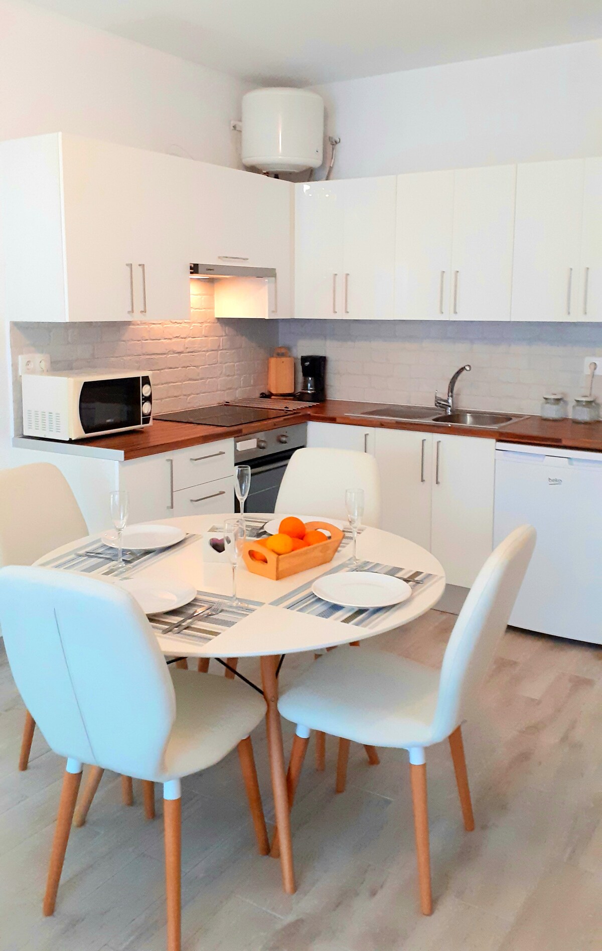 Apartemen ini terdiri dari kamar tidur dengan dua tempat tidur dan ruang tamu dengan dapur kecil. Dirancang untuk 4 orang, sofa yang sangat nyaman di ruang tamu dilipat ke dimensi 140x200cm. Apartemen ini dilengkapi dengan kompor listrik tanpa oven, kulkas, semua aksesori dapur yang diperlukan - piring, panci, ketel, pembuat kopi Italia. Di kompleks ini, kolam renang berpemanas, lapangan tenis, tenis meja, biliar.