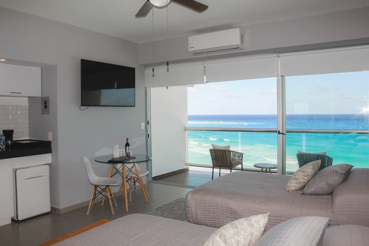 Studio yang baru saja direnovasi terletak tepat di pusat zona hotel Cancun, dengan teras yang indah dan pemandangan laut yang menakjubkan di dekat restoran dan aktivitas hiburan malam yang menyenangkan. Studio ini memiliki sentuhan modern dengan teras yang indah untuk menghabiskan waktu dan menikmati pemandangan dan suara laut dengan secangkir kopi, anggur, atau sekadar bersantai di hammock. Tempat ini memiliki dua tempat tidur berukuran queen, tempat tidur tipe sofa, dapur lengkap, dan meja makan. Tempat ini juga juga memiliki tv layar datar dan layanan wifi.