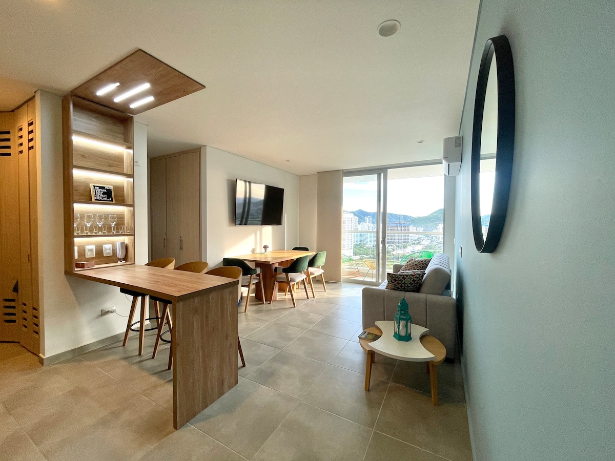 Apartemen modern baru yang spektakuler di lantai 17 dengan pemandangan laut dan akses langsung ke pantai. Tempat yang bagus untuk berlibur, beristirahat dan atau bekerja di kantor rumah. 10 menit ke bandara internasional dan pusat bersejarah Santa Marta, dekat dengan area restoran, bar, pusat perbelanjaan, dan apotek. Kurang dari satu jam dari Taman Nasional Tayrona, Taganga, Minca. Apartemen ini memiliki balkon besar tempat Anda bisa menikmati matahari terbenam terbaik di Kolombia.
