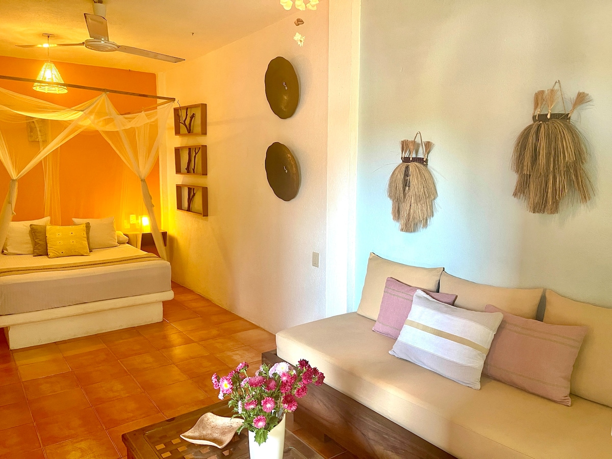 Selamat datang di apartemen studio kami yang nyaman di pusat Zipolite, hanya 5 menit berjalan kaki dari jalan komersial yang semarak dan pantai. Ruang yang menawan ini dirancang untuk dua tamu, menampilkan tempat tidur queen, sofa yang nyaman, dapur lengkap, dan kamar mandi. Keluar untuk menikmati udara segar dari balkon pribadi Anda atau bersantai di bak mandi luar ruangan. Studio ini terletak di samping jalan utama dan berfungsi sebagai tempat liburan yang sempurna untuk membenamkan diri Anda dalam gaya hidup pantai Zipolite yang santai.