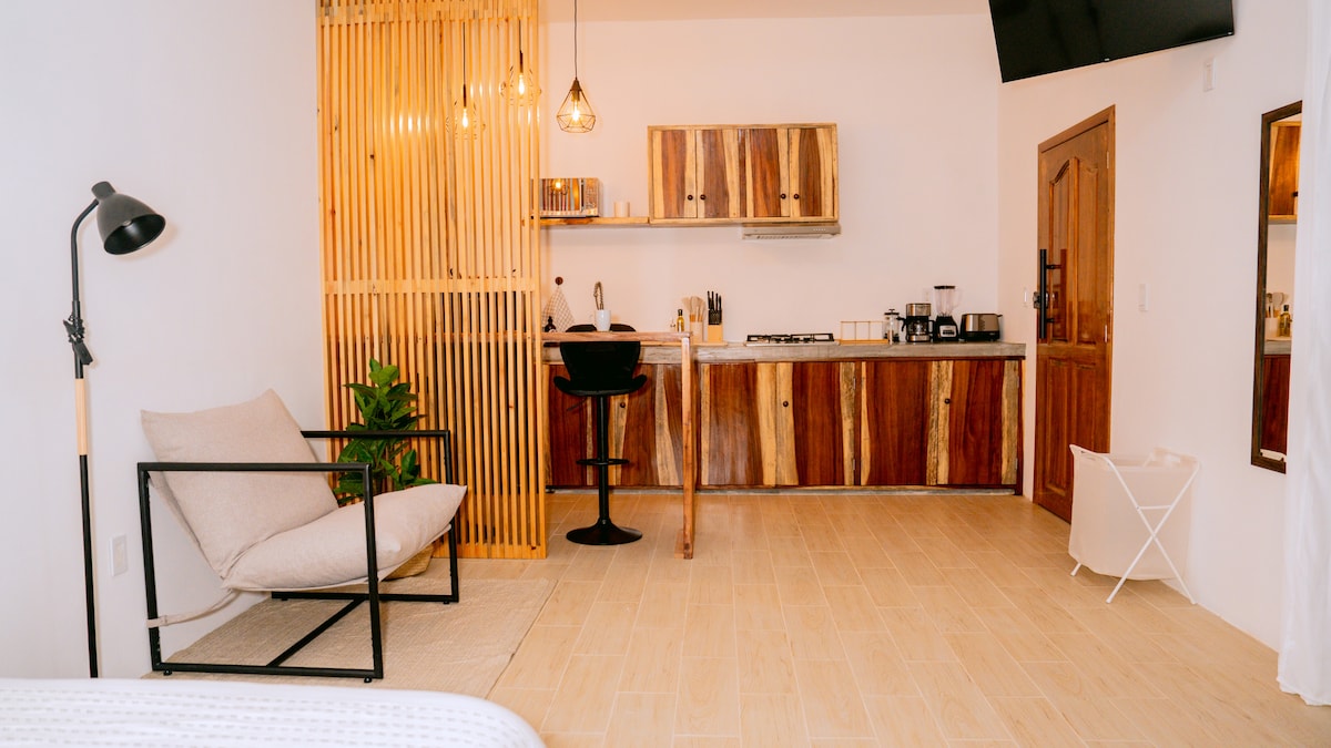 Opal Suite di La Joya San Agustinillo adalah tempat perlindungan yang dirancang untuk privasi dan kenyamanan tertinggi. Suite utama mewah ini, seperti yang ditunjukkan dalam foto - foto, menawarkan tempat peristirahatan yang luas dan lapang yang menyambut angin laut dan membingkai pemandangan indah pantai, laut, dan lanskap San Agustinillo yang rimbun. Tamu bisa menikmati kesendirian yang damai, suara alam yang menenangkan, dan fasilitas modern yang meningkatkan pengalaman secara keseluruhan, menjadikannya tempat yang sempurna untuk bersantai dan bersantai dengan penuh gaya.