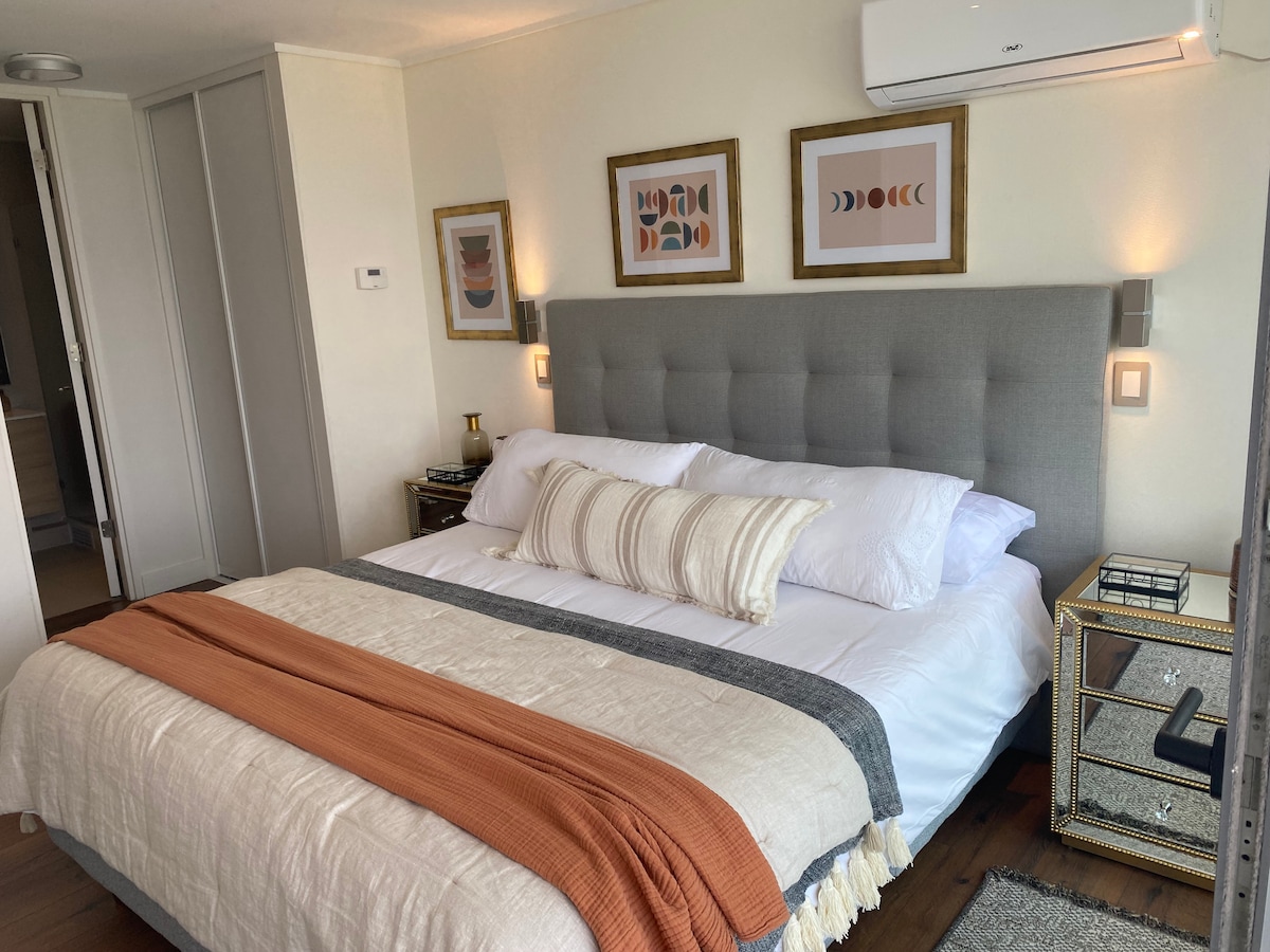 Apartemen modern dan nyaman dengan AC di pusat kota Santiago. Beberapa langkah dari metro dan Pusat Bersejarah, dikelilingi museum, pasar, dan restoran. Tempat tidur berukuran king, dapur lengkap, balkon, dan wifi cepat, ideal untuk perjalanan atau masa inap jangka panjang. Bangunan aman dengan concierge 24/7. Perhatian yang dipersonalisasi, check-in fleksibel, dan rekomendasi lokal sehingga Anda bisa menikmati kota seperti penduduk asli, dengan kenyamanan dan ketenangan pikiran.