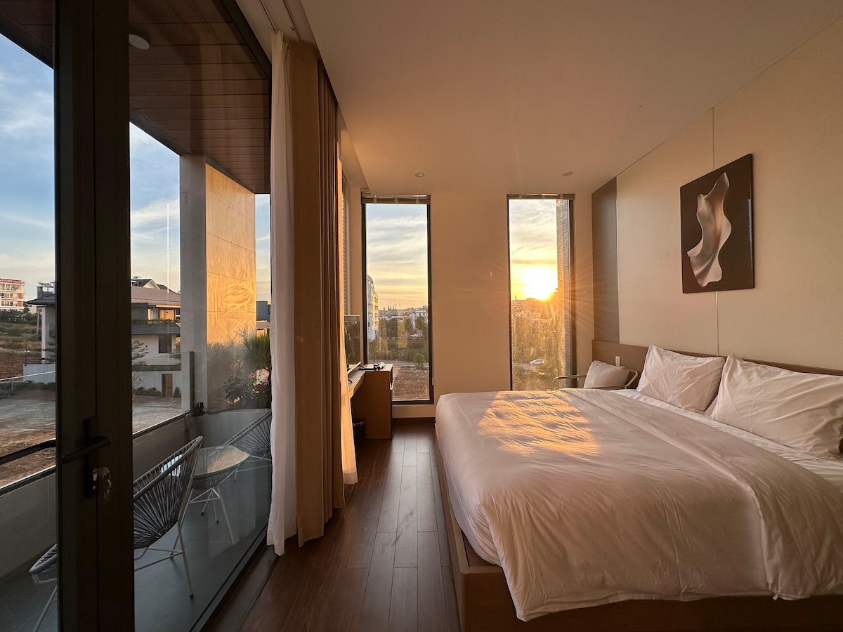 Lumi Room is inspired by Nordic design, featuring a clean white palette, bright open space, and refined minimalism. Sunlight streams through large glass windows, bathing the room in a soft glow reminiscent of a Northern winter. Warm wooden accents blend with crisp white tones to create a calm and airy atmosphere. A private balcony welcomes fresh air and Pleiku’s golden sunsets. An ideal retreat to rest, breathe deeply, and embrace serene simplicity.