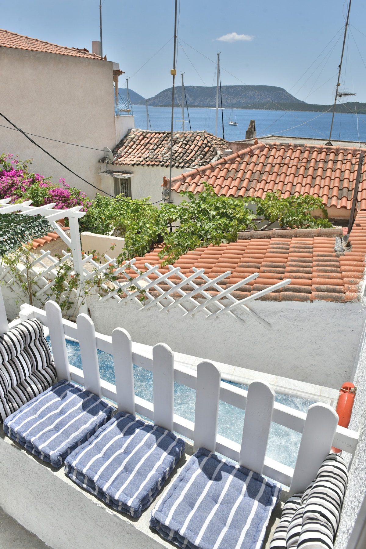 Enjoy this spacious, bright house, its large terrace with a stunning view of the old town of Poros island and the Aegean sea. Relax by the trees in the hammock or outdoor bath while sipping a glass of wine or morning coffee watching the boats go by. Our place is perfect for families and friends. Great spot from which you can explore Poros and Peloponnese. We will share with you the best tips about beaches, nearest 5min walk, restaurants, coffee shops, activities you can do or sites you can visit