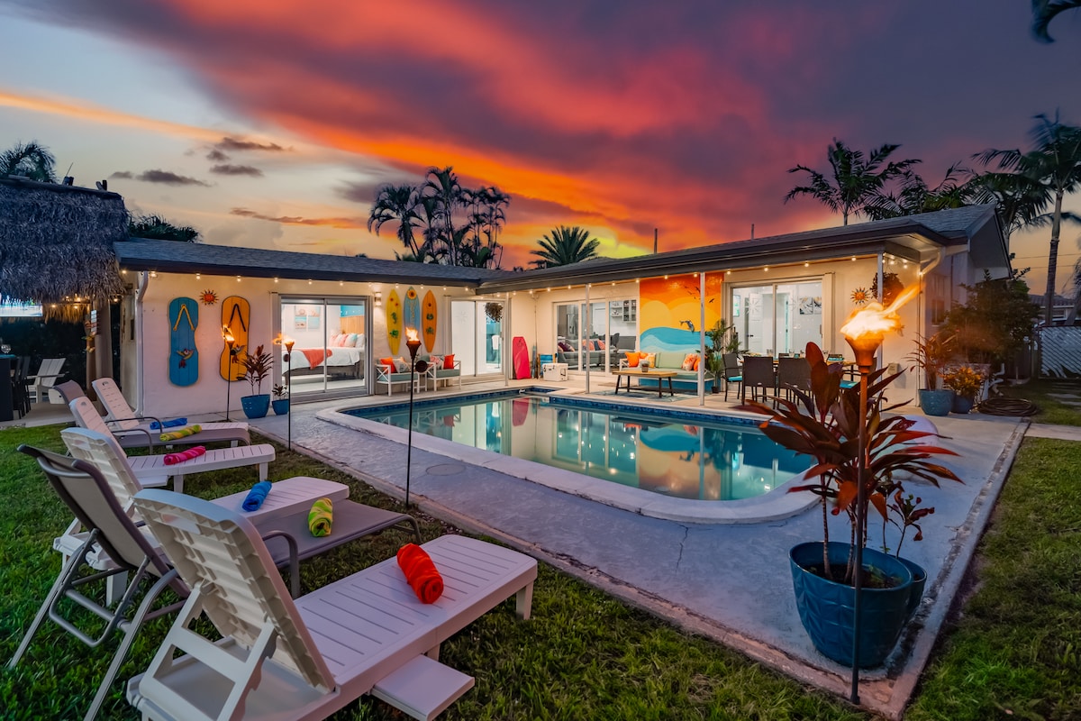 all in love with breathtaking water views of a serene canal, just a mile from the ocean. Whether you're sharing a glass of wine under the stars, enjoying a movie at the tiki bar, relaxing in the heated pool, or swaying in one of the hammocks, Sunset Villa transforms every evening into a slice of paradise. For daytime adventures, embark on exciting kayak rides or cast a line to see what the tide brings in. Nearby fine dining and vibrant nightlife ensure a perfect stay. Sec cameras