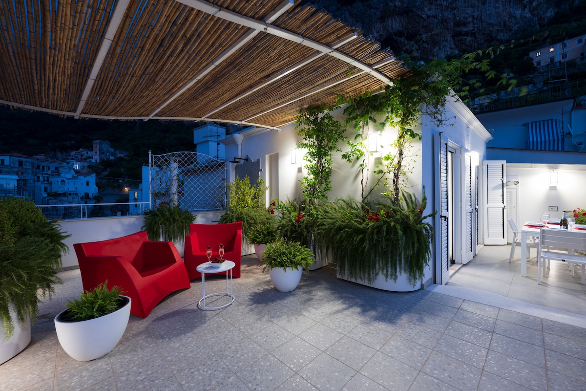 Appartamento ad Amalfi, con vista mare, terrazza e free wi-fi. E' la soluzione ideale per famiglie, coppie e gruppi di amici. L'alloggio dista dal centro di Amalfi circa 500 metri sulla strada, più 120 comodi scalini, una bella passeggiata con vista panoramica.