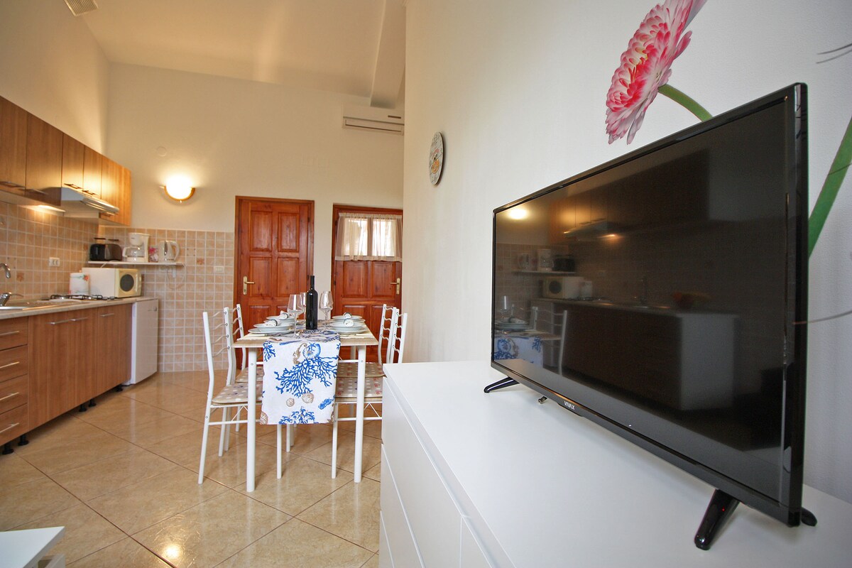 Properti ini mencakup 35m2 dan dapat menampung jumlah orang berikut: 2+1. Di apartemen ada satu kamar tidur, satu ruang tamu di mana satu orang bisa tidur di sofa, dapur, kamar mandi dengan pancuran dan teras besar dengan bagian pribadi taman yang dilengkapi dengan pemanggang dan furnitur taman. Dapur dilengkapi dengan meja dan kursi untuk setiap orang; peralatan dapur, panci, peralatan makan, peralatan makan, pakaian piring, kompor listrik, kulkas dengan kompartemen freezer, mesin kopi. Rumah terpisah, AC, AC termasuk dalam harga, Sat - TV, seprai dikirimkan dalam perubahan mingguan, handuk disediakan (2 handuk kecil per orang per minggu), internet (WLAN), penggunaan gratis, harga termasuk yang berikut: penggantian seprai (mingguan), pembersihan akhir di akhir masa inap Anda, penggunaan listrik, air, pajak, dan parkir. Teras sendiri, meja dan kursi disediakan untuk teras, luas teras 20m2. Mesin penatu di rumah.