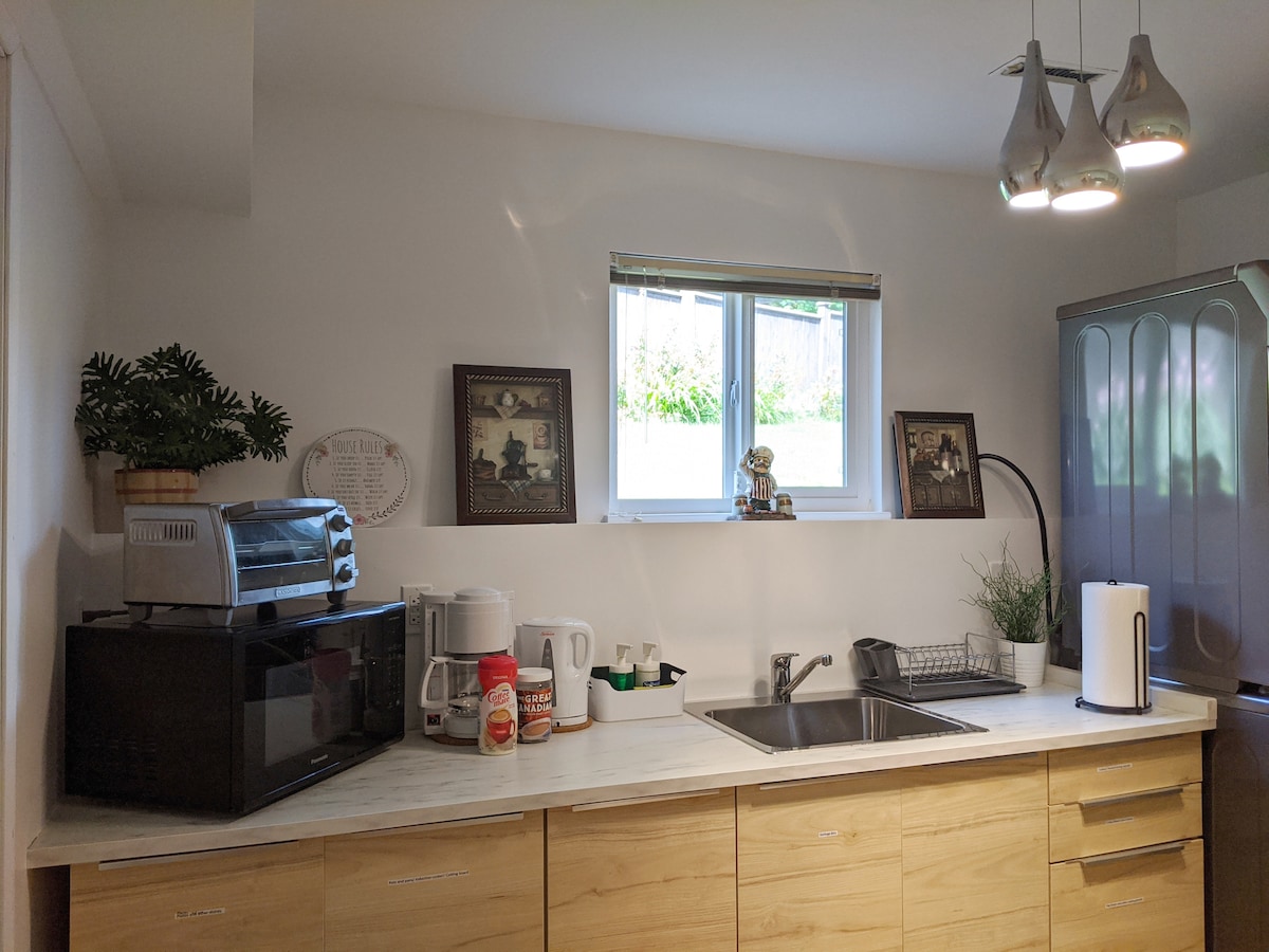 Tucked in a safe and pleasant neighbourhood, our guest suite is located inside a family home and has its own private walk out entrance for total privacy. With plenty of natural light, it is spacious, bright and cozy - ideal for anything from a weekend getaway to week-long business trip. The King size bed provides ample space for a restful sleep. Living room is equipped with a 50-inch smart TV. Netflix and Prime streaming are just a button press away.