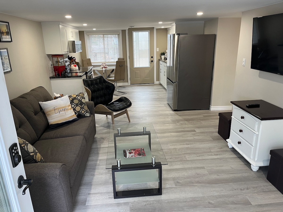 Baru - baru ini kami merenovasi ruang bawah tanah kami untuk menciptakan suite tamu yang bergaya, modern, nyaman, dan tenang. Ada pintu masuk samping yang terbuka langsung ke tangga yang membawa Anda turun ke unit. Tempat ini memiliki pintu eksterior logam pengunci untuk kedap suara dan keamanan. Unit ini adalah apartemen studio terang dengan tiga jendela besar, dapur lengkap, area duduk dengan TV dan perapian, meja makan, tempat tidur berukuran queen, lemari walk - in, dan kamar mandi pribadi Anda sendiri dengan pancuran lima kaki. Dengan kedap suara yang luas!