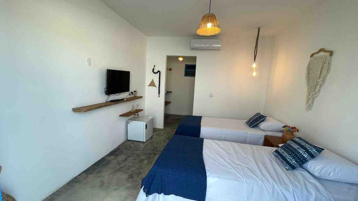 Nos quartos, há TVs com Netflix, ar condicionado split, Wifi, e frigobar abastecido com água, refrigerante, cerveja, e petiscos disponíveis para compra.