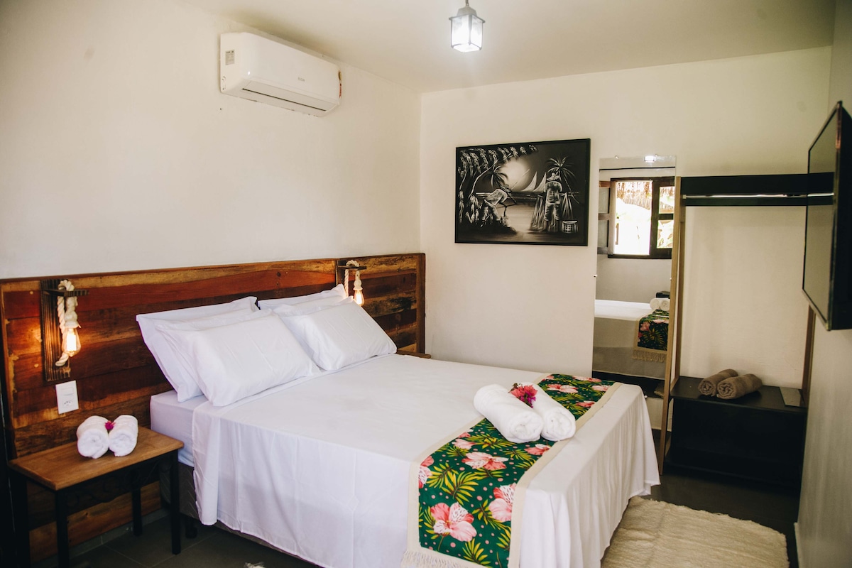 O quarto possui uma cama queen, frigobar, smart TV e ar-condicionado split, oferecendo privacidade e máximo conforto para duas pessoas.