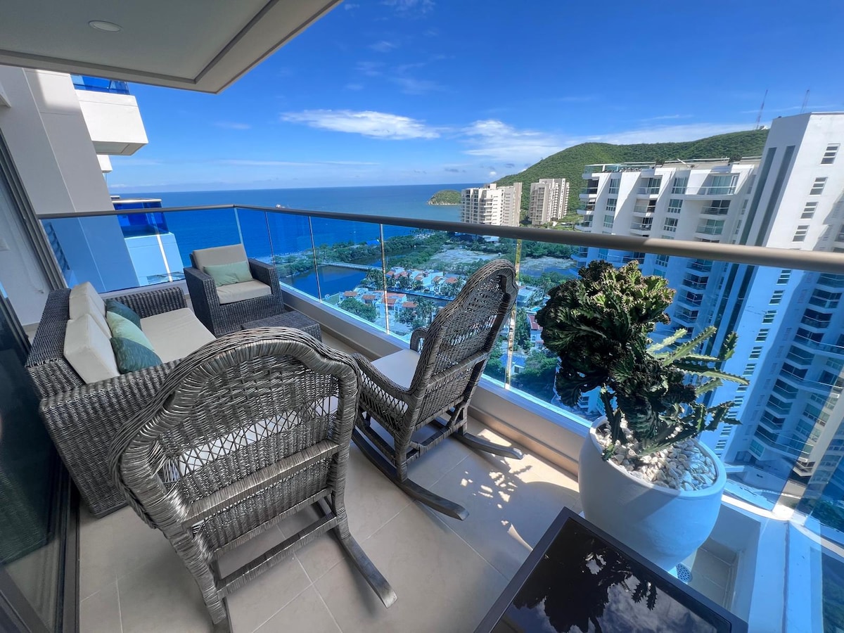 Espectacular apartamento moderno para estrenar en un piso 17 con vista al mar y salida directa a la playa. Espacio agradable para tomar vacaciones, descansar y/o trabajar home office. A 10 minutos del aeropuerto internacional y del centro histórico de Santa Marta, cerca a zona de restaurantes, bares, centros comerciales y farmacias. A menos de una hora del Parque Nacional Tayrona, Taganga, Minca. El apartamento cuenta con un amplio balcón donde podrás disfrutar del mejor atardecer de Colombia.