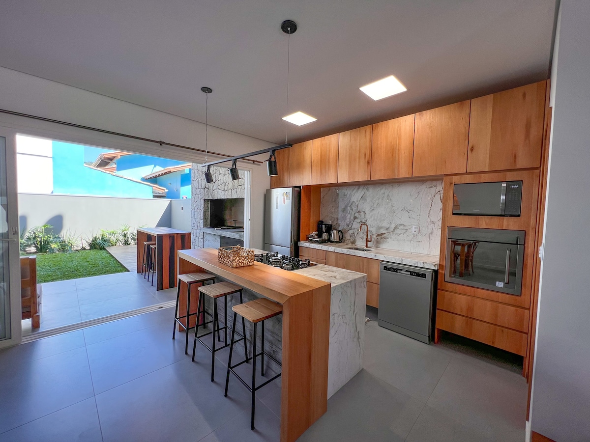 The house is new, modern, airy, bright, with lots of natural light and a beautiful heated overflow pool, great comfort for spending time on the beautiful Garopaba beach. All furniture, appliances and decoration are new, in the Jardim Panorânico neighborhood, on the coast of Praia do Silveira, 15 minutes walk from the central beach and also Praia do Silveira, and 5 minutes walk to downtown. Quiet neighborhood, perfect for those looking for rest an peace, and at the same time, near of everything.