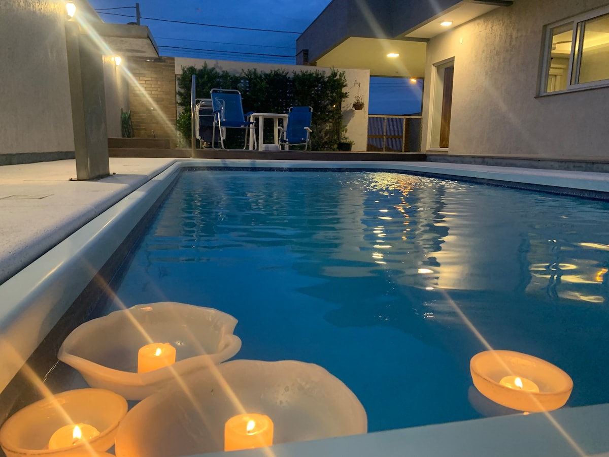 Baca PERATURAN RUMAH sebelum memesan. Anda akan setuju untuk mematuhinya saat memesan. Rumah dengan 3 kamar tidur, 1 kamar tidur queen bed suite, 1 kamar tidur double dan 1 kamar tidur pembantu rumah dengan tempat tidur double. AC di semua tempat. Kolam pemanas surya, wi-fi, meja biliar, barbekyu luar ruangan dan dalam ruangan, oven, mikro, dll. Rumah ini bisa menampung hingga 8 orang, termasuk sofa ruang tamu. Alamat: Bairro Atlântida - Cidade Xangri - la
