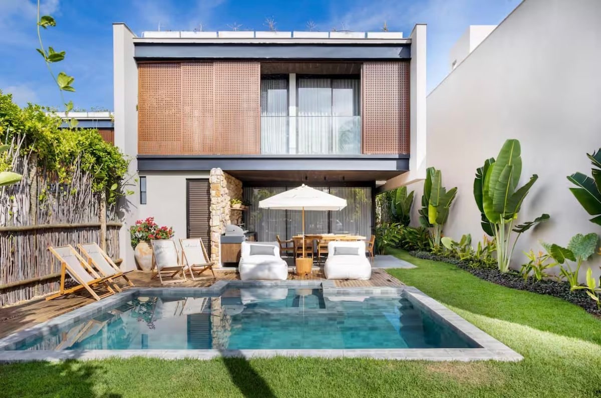 • Lokasi Utama: Dekat ke pantai dan Kapel Milagres. • Sorotan Eksklusif: Kolam renang pribadi di atap dan area barbekyu. • Akomodasi Lengkap: 3 kamar tidur en - suite ber AC. • Area Dalam Ruangan: Ruang tamu yang nyaman dan dapur berfasilitas lengkap. • Internet: Wi - Fi berkecepatan tinggi. • Area Luar Ruangan: Teras yang luas dengan tempat tidur gantung dan pemandangan kebun kelapa, cocok untuk bersantai. • Keamanan: Kondominium Pribadi dengan security 24 jam.