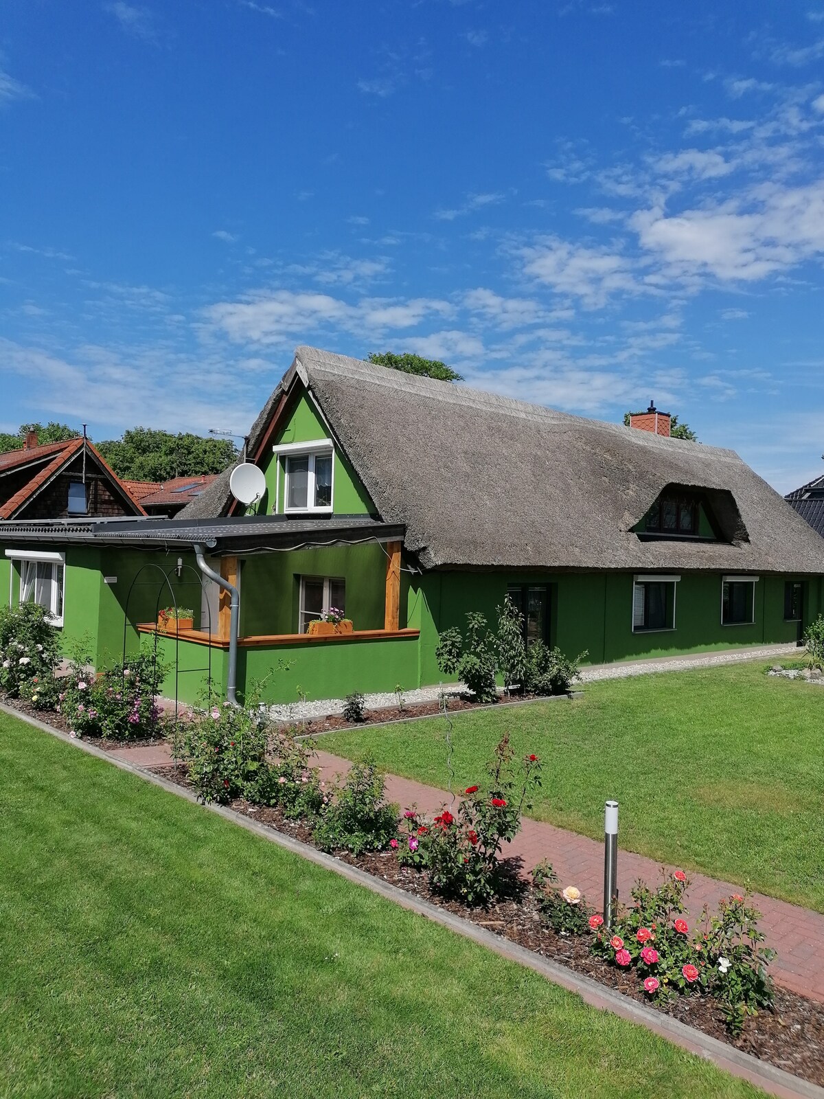 Anda akan menginap di rumah kapten bergaya pedesaan yang indah di Wieck/Darß. Di bawah atap jerami, apartemen dengan luas permukaan sekitar 65 meter persegi ini menawarkan dua kamar tidur dengan tempat tidur double atau tempat tidur sofa double, satu kamar mandi dengan shower dan toilet, serta ruang tamu terbuka dengan dapur dan area makan. Dapur berisi mesin cuci piring, microwave, kulkas, dan mesin kopi. Di ruang tamu ada TV satelit. Wifi tersedia di seluruh apartemen.