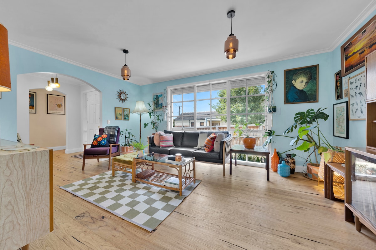 Pondok pekerja berusia 100 tahun ini adalah tentang interior yang dipesan lebih dahulu Dinding dan rak yang dipenuhi dengan karya seni yang indah, rumah ini memiliki barang - barang vintage yang bersumber secara khusus yang tersebar di mana - mana, tempat tidur dipenuhi dengan seprai mewah dan lounge ini memiliki sofa 3 tempat duduk yang mungkin tidak ingin Anda bangun. Berada di pusat, di seberang jalan dari South Melbourne Markets, cukup berjalan kaki ke Albert Park Lake dan perjalanan trem singkat ke CBD. Harap perhatikan - tidak ada TV, jadi bawalah perangkat jika diperlukan.
