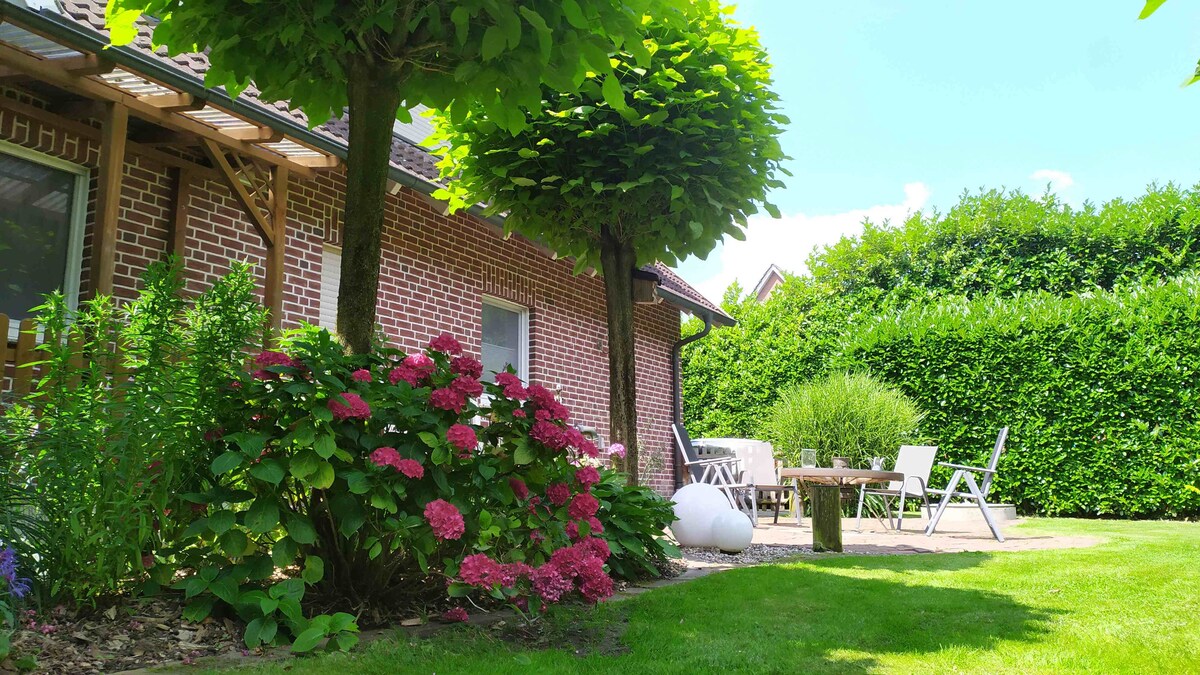 Our apartment is a small, attached cottage with terrace and garden. It is located in a quiet residential area in the center of Raesfeld-Erle, a 360-soul village on the edge of the Ruhr area. Here you combine Münsterland flair with everything that the big metropolises offer. In Erle stands the oldest oak in Germany. A chestnut avenue, the rustic schnapps distillery and the old windmill also invite you to cycle and walk on numerous hiking routes.