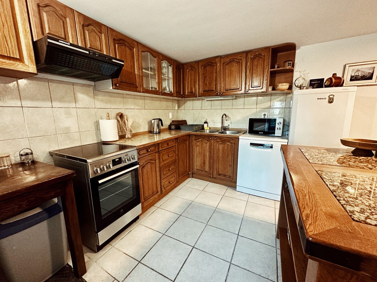Rumah baru yang luas dengan taman dan kebun yang bagus (294m2), 2 kamar tidur besar, ruang tamu dengan tempat tidur, 3 kamar mandi (1 di lantai pertama, 2 di lantai lain), kolam pijat, perapian batu, garasi dan parkir pribadi gratis. Terletak di antara laut dan danau Merah dan Biru yang terkenal, Dalmatian Inland. Diambil untuk anak - anak Ideal untuk liburan, barbekyu, permainan anak - anak, berjalan - jalan panjang di jalan - jalan terdekat, kayak di sungai Vrljika, hiking di gunung Biokovo dengan pemandangan langit atau pantai di Adria (berjarak 20 menit dengan mobil).