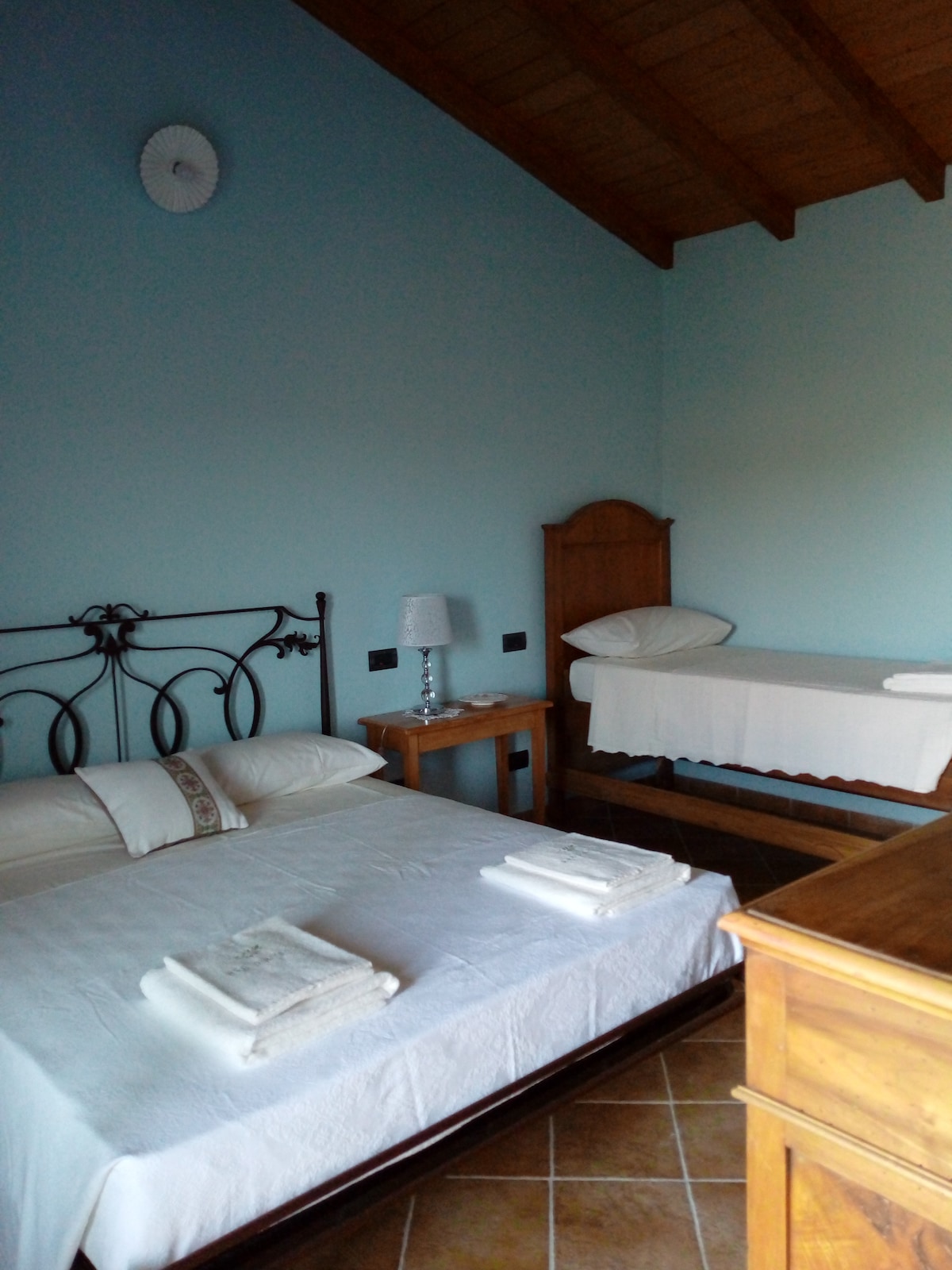 Il calore del tetto in legno, le pareti azzurro cielo, un grande letto tutto nuovo, un antico letto dell'Ottocento per il terzo ospite. Nel bagno abbiamo scelto di non mettere il bidet per lasciare spazio a una grande doccia in pietra naturale con idromassaggio e cascata.