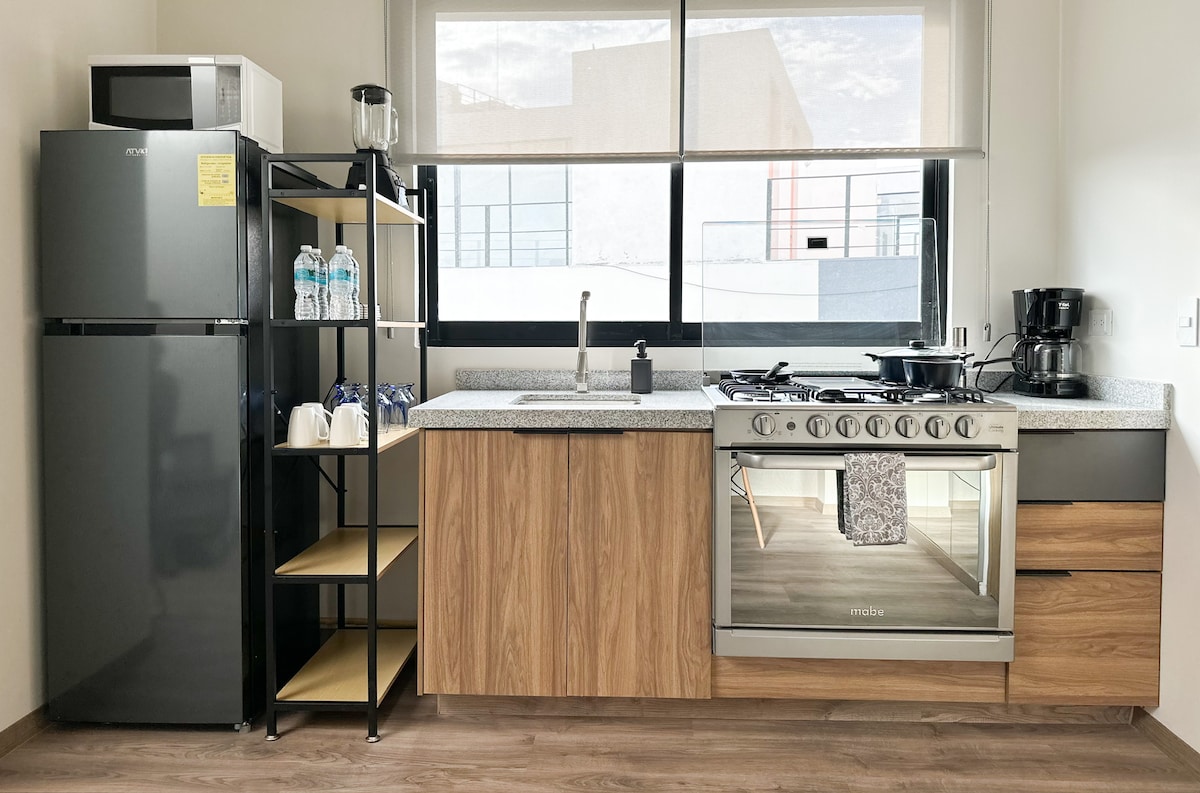 Enjoy a quiet and centrally located stay in the heart of Puebla’s Historic Center. This fully equipped one-bedroom apartment features two balconies with street views. Located just two blocks from the Zócalo, Puebla Cathedral, and the Palafoxiana Library. A comfortable option to experience Puebla on foot, with everything you need for a practical and pleasant stay.