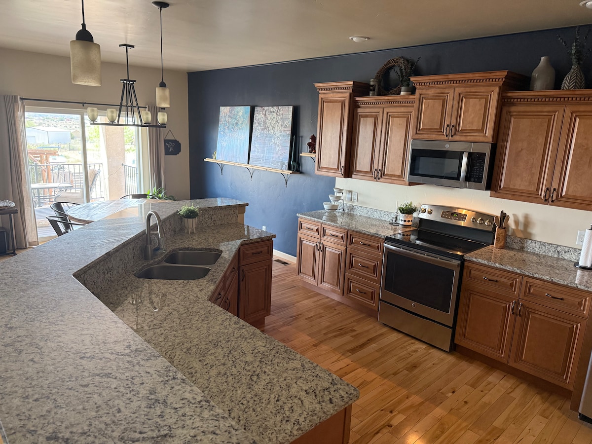 Rumah 4 kamar tidur yang luas di cul-de-sac yang tenang di dekat CSU Pueblo, golf, & pusat perbelanjaan. Rumah bergaya Spanyol ini memiliki karya seni Barat, halaman belakang pribadi yang luas dengan lapangan olahraga untuk pickleball & bola basket, perapian, pemanggang, patio, permainan halaman. Di dalam: langit-langit 17', TV 4K 85”, sofa kulit, oven ganda, Keurig, Wi-Fi cepat, & penatu lengkap. Suite master dengan tempat tidur king, lemari pakaian, jet tub, & shower. Kantor dengan meja kayu ek & layar 34” untuk pekerjaan jarak jauh. Sangat cocok untuk keluarga, pasangan, atau rombongan.